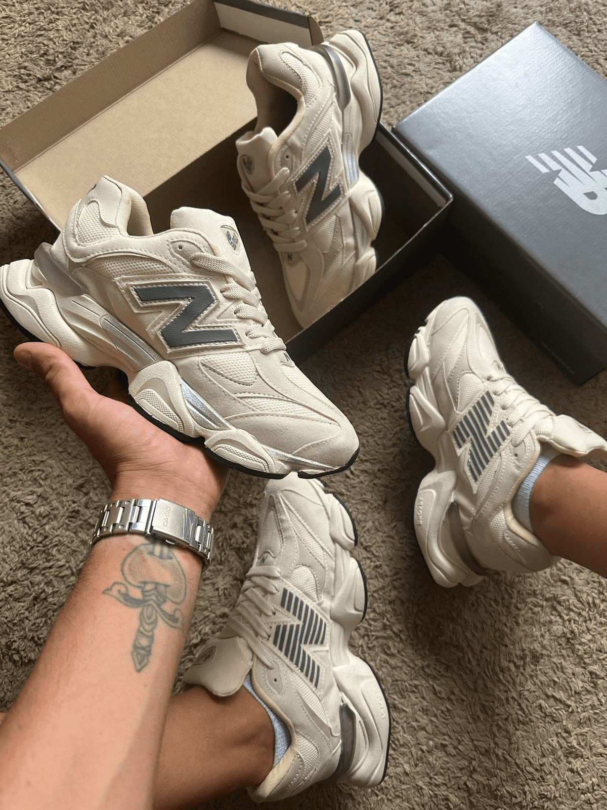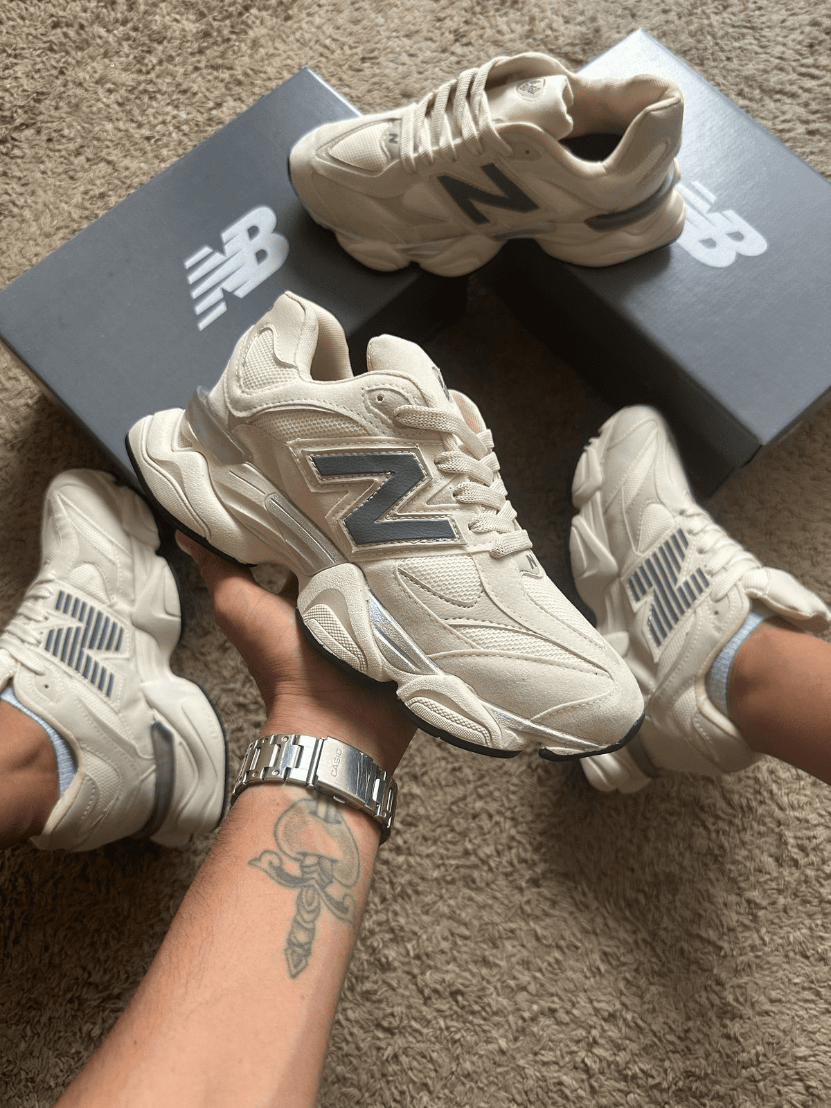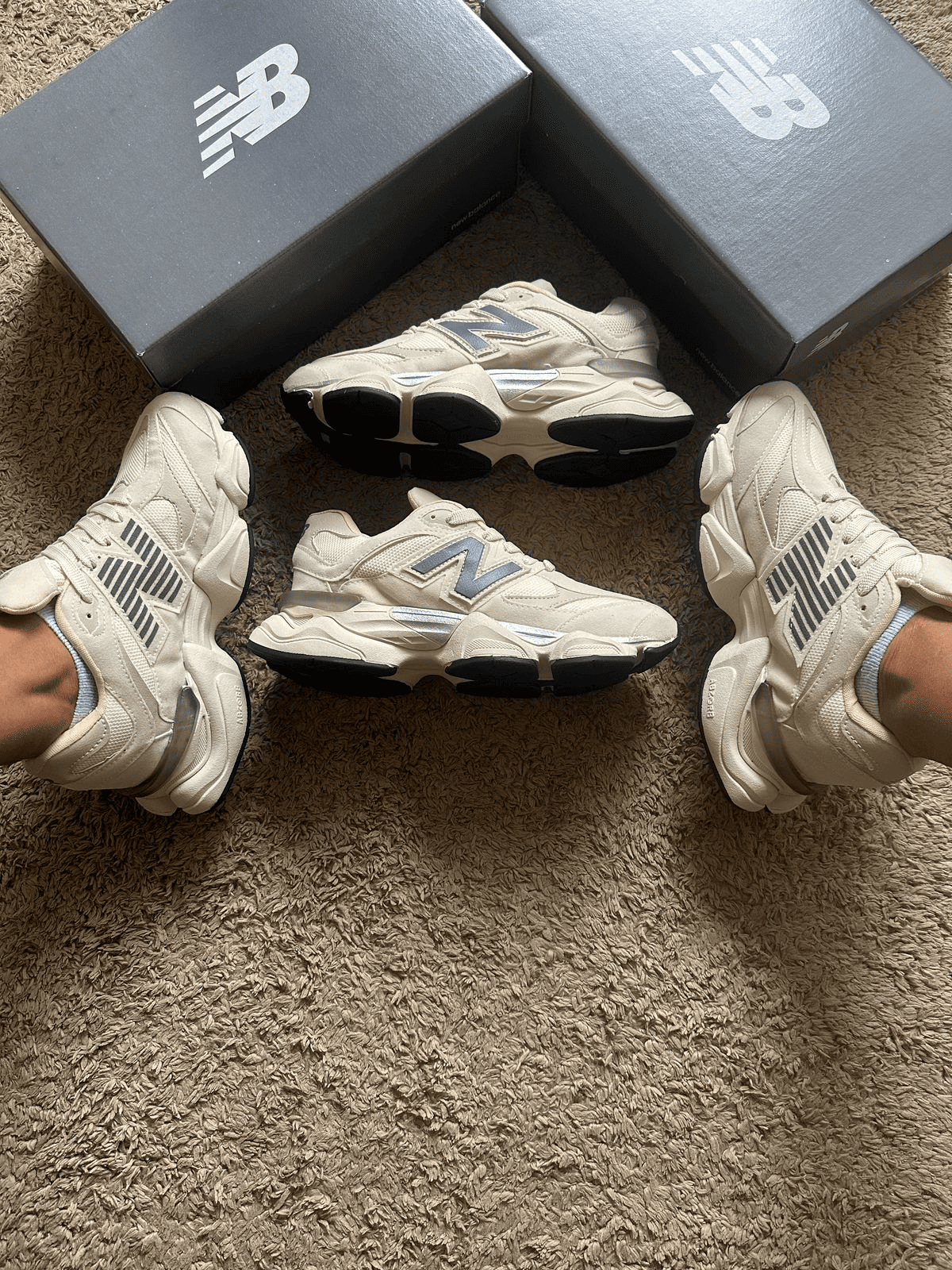 ✅ 1ª linha – edição: New Balance 9060 bege com cinza